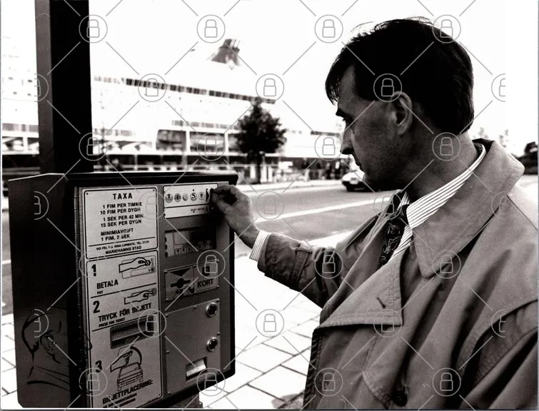 parkeringsautomat, man, kostym, gata, bil, träd, byggnad, betalning, mynt, kort, taxa, instruktioner, svartvit, stadsmiljö, trottoar, parkeringsplats, trafik, urban, klocka, slips