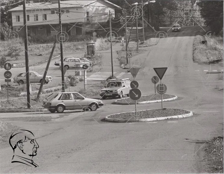 väg, trafik, rondell, bilar, skyltar, korsning, svartvit, landskap, byggnader, elledningar, gräs, vägskyltar, fordon, vägmarkeringar, träd, asfalt, stadsbild, parkering, vägkorsning, trafikljus