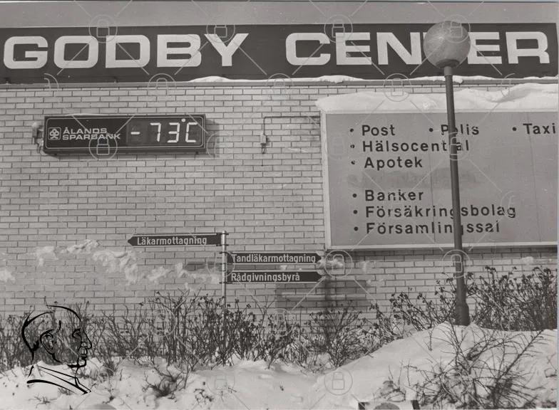 Hoodby Center, temperatur, -73C, Post, Polis, Hälsocentral, Apotek, Banker, Försäkringsbyrå, Församlingshus, Läkarmottagning, Tandläkarmottagning, Rådgivningsbyrå, skyltar, byggnad, snö, svartvitt, samhälle, service, verksamheter, information
