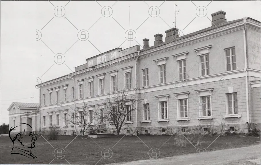 byggnad, fasad, fönster, träd, gräs, flaggstång, tak, gammal, arkitektur, svartvit, skola, institution, gård, väggar, dörrar, landskap, historia, stil, detaljer, miljö