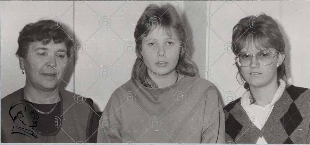 kvinna, porträtt, svartvitt, frisyr, ansikte, tröja, inomhus, sittande, uttryck, 1980-tal, retro, vintage, allvarlig, ung, person, foto, gammaldags, stil