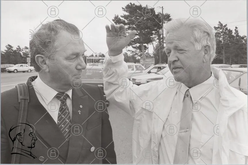 två män, svartvitt, kläder, kostymer, bil, parkering, träd, samtal, gestikulerande, ansiktsuttryck, 1980-tal, utomhus, fotografi, historiskt, mänsklig interaktion, affärsmän, socialt, miljö, landskap, nostalgi