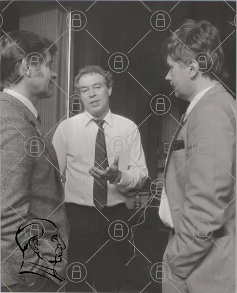 svartvitt, tre män, konversation, kostymer, slipsar, kontor, diskussion, inomhus, formellt klädda, äldre foto, 1970-tal, grupp, stående, kommunikation, arbetsplats, möte, professionellt, mänsklig interaktion, affärsmiljö, retro stil