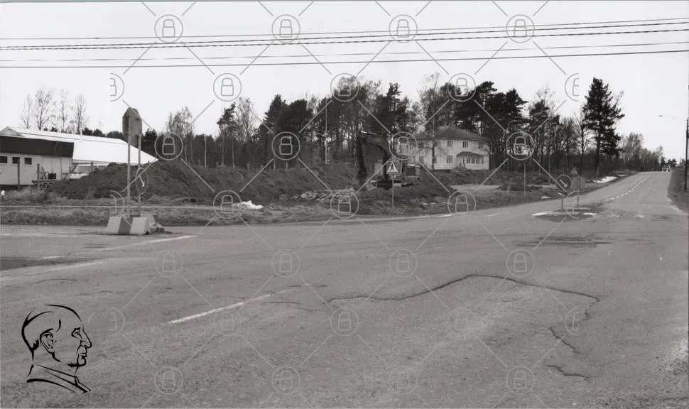 väg, byggarbetsplats, grävmaskin, träd, hus, asfalt, trafikskylt, landskap, svartvit, konstruktion, vägkorsning, markarbete, natur, byggmaterial, grus, ledningar, signaler, vägmarkeringar, tomt, arbete, maskiner, byggprojekt, omgivning, infrastruktur, transport, vägtrafik, byggnation, område, stadsutveckling, miljö