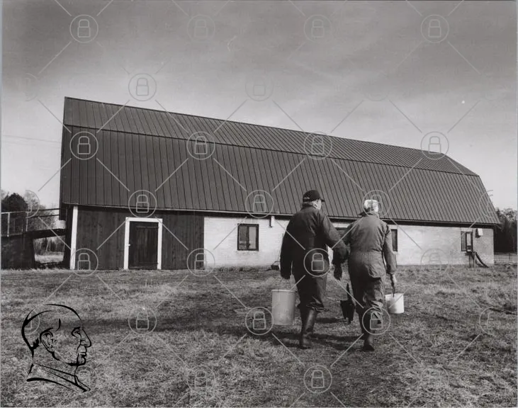 svartvitt, ladugård, två personer, hinkar, landskap, gräs, byggnad, tak, promenad, utomhus, gammal stil, jordbruk, kläder, landsbygd, himmel