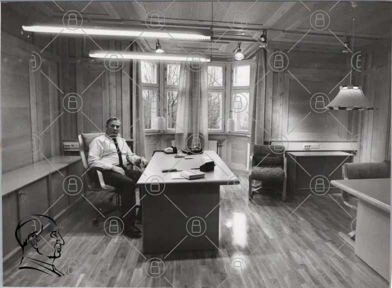 kontor, man, skrivbord, stol, fönster, trä, belysning, telefon, dokument, gardiner, svartvitt, professionell, inredning, affärsmiljö, kontorsutrustning, sittande, arbetsplats, modern, stilren, rum, kontorsstol, arbetsliv, kontorslandskap, ljus, väggar, golv, möbler, kontorsmiljö, seriös