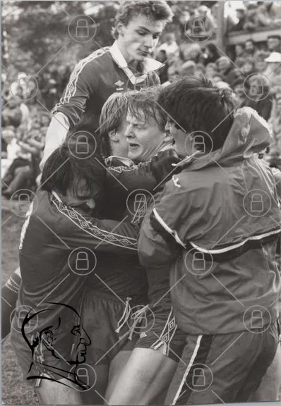 fotboll, spelare, jubel, lag, sport, svartvitt, match, träning, glädje, samarbete, utbyte, känslor, publik, tröjor, fotbollsplan, 1980-tal, manliga, tävling, gemenskap, seger, huddle, celebration, teamwork, idrott, motion, prestation, kamratskap, energi, entusiasm, tradition