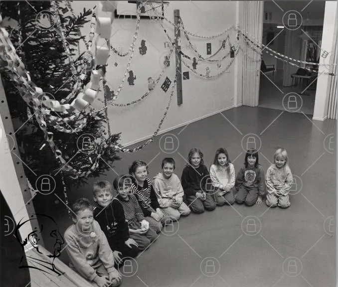 barn, jul, gran, dekorationer, leende, samling, inomhus, svartvit, fest, pyssel, glädje, tradition, skola, julkort, pappersgirlander, kläder, vänskap, gemenskap, aktiviteter, barndom