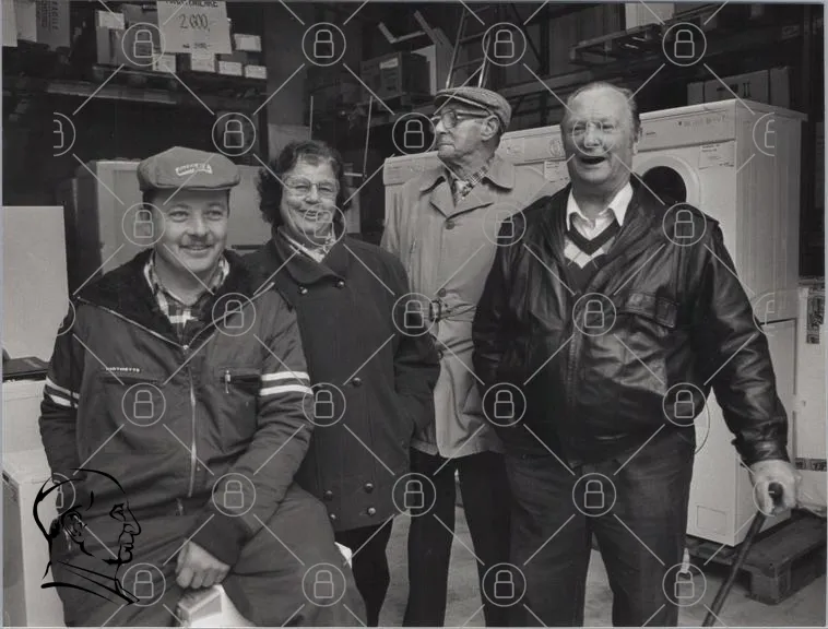 män, kvinnor, leende, lager, kläder, hattar, jackor, svartvitt, grupp, vänner, samarbete, arbetsplats, äldre, stående, sittande, interaktion, gemenskap, bakgrund, maskiner, tvättmaskiner, förråd, nostalgi, fotografi, 1980-tal, ansikten, uttryck, tradition, historia