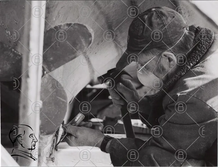 hantverkare, skulptör, verktyg, hammare, mejsel, arbete, konst, skulptur, hantverk, arbetskläder, skyddsglasögon, koncentration, traditionellt hantverk, konstnär, skapande, man, svartvit bild, detaljarbete, handarbete, konstnärlig process