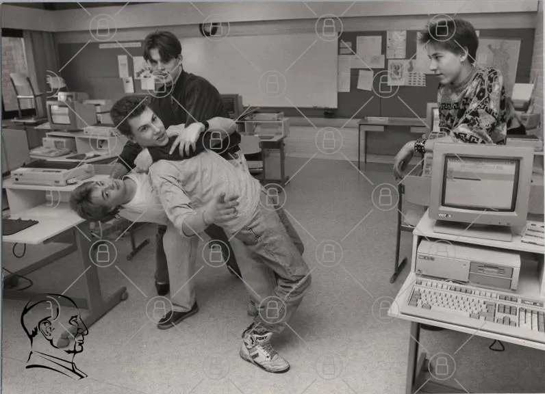 skola, elever, klassrum, datorer, ungdomar, svartvitt, lek, vänskap, skratt, aktiviteter, 1990-tal, pojkar, kläder, interaktion, lärande, teknik, kreativitet, socialt, grupp, humor