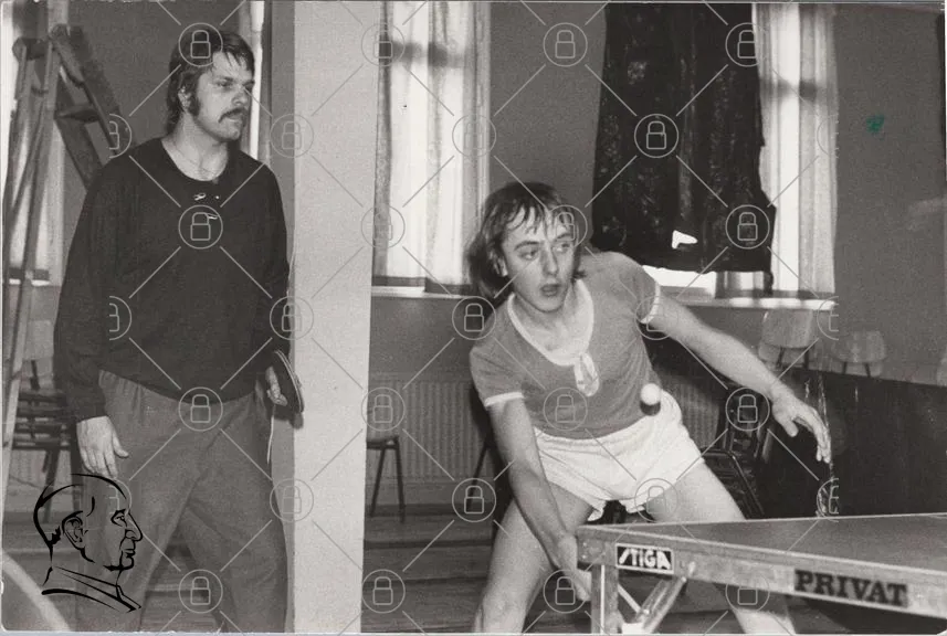 bordtennis, spelare, träning, sport, inomhus, svartvitt, racket, boll, koncentration, tävling, 1970-tal, man, ungdom, aktivitet, motion, gym, förening, tävlingsanda, teknik, precision, samarbete