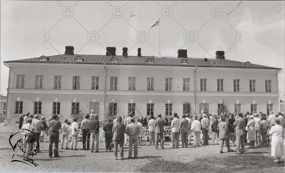 byggnad, flagga, människor, samling, utomhus, svartvit, historisk, evenemang, publik, talare, träd, fönster, tak, kläder, 1900-tal, ceremoni, tradition, plats, uppvaktning, fotografering, minne, fest, kultur, samhälle, historia, landskap, aktivitet, grupp, stämning, högtid