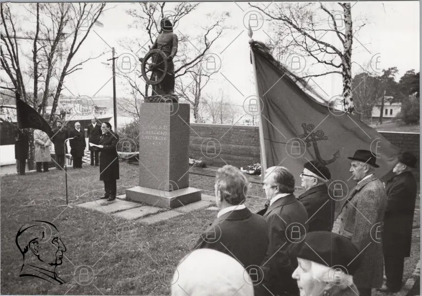 staty, monument, ceremoni, flagga, talare, publik, träd, historisk, minnesstund, sjöman, skulptur, kläder, svartvitt, högtid, plats, tradition, samling, människor, minne, kultur