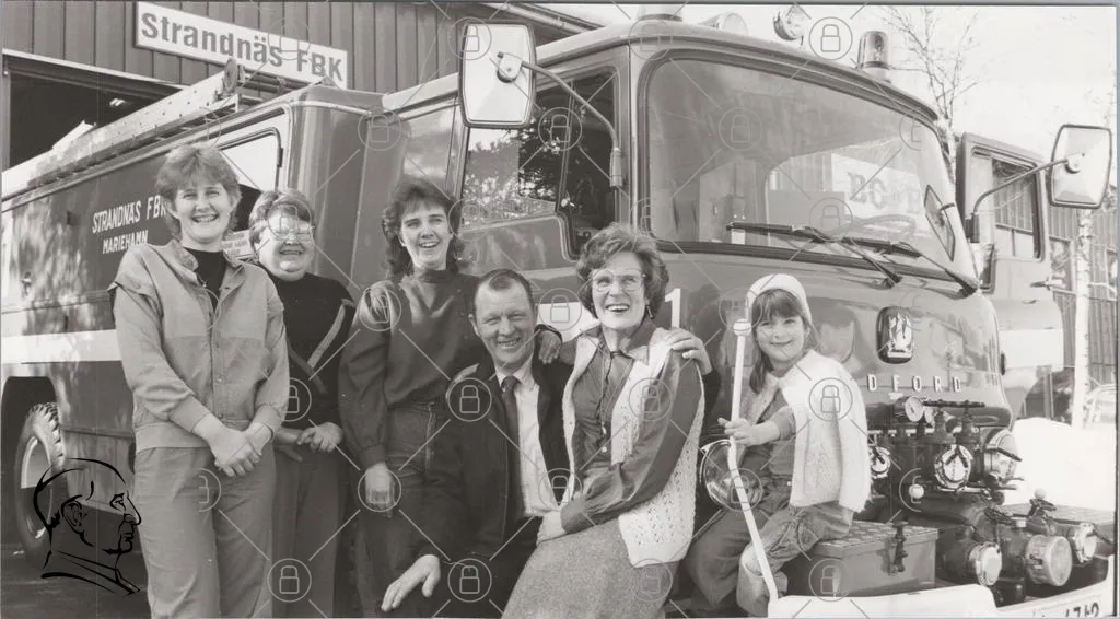 brandbil, familj, gruppfoto, leende, barn, vuxna, utomhus, svartvitt, kläder, glasögon, mössa, jacka, tröja, skjorta, byggnad, fönster, spegling, fordon, räddningstjänst, skylt