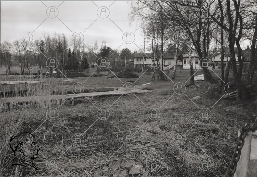 svartvitt, landskap, träd, hus, brygga, sjö, gräs, buskar, himmel, moln, staket, stenar, natur, vår, skog, trädstammar, kvistar, byggnader, tomt, strand