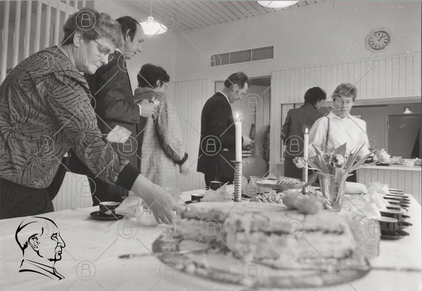 fest, tårta, människor, bord, ljus, svartvitt, servering, kläder, kaffe, dukning, samvaro, 1960-tal, bakverk, festligheter, inomhus, socialt, tradition, dekoration, samtal, uppvaktning, festmåltid, gemenskap, stil, retro, evenemang, kultur, minnen, historia, feststämning