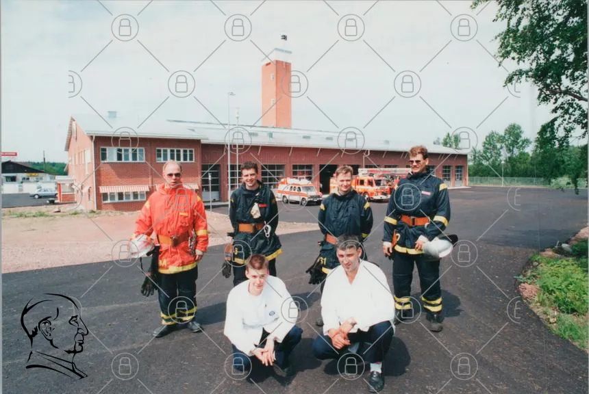 brandstation, brandmän, uniformer, brandbilar, röd byggnad, hjälmar, skyddsutrustning, gruppfoto, utryckningsfordon, asfalt, brandtorn, säkerhet, räddningstjänst, utomhus, teamwork