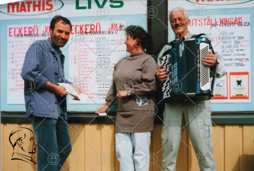 man, kvinna, dragspel, lista, affisch, sommar, musik, utomhus, leende, kläder, trä, fönster, text, information, evenemang, kultur, tradition, nöje, samvaro, glädje, aktivitet, samhälle, fest, minnen, fotografi, retro, 1990-tal, Sverige, landsbygd
