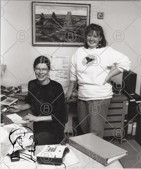 kontor, kvinnor, arbete, dator, papper, skrivbord, glasögon, leende, kontorsmiljö, 1980-tal, dokument, kalkylator, kontorsutrustning, telefon, kollegor, samarbete, kontorsarbete, professionellt, svartvitt, fotografi