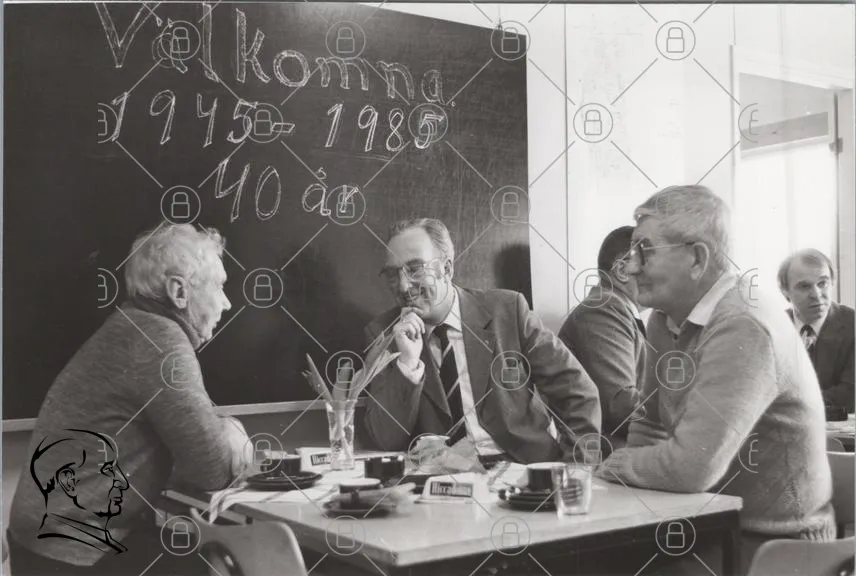 svartvitt, människor, bord, kaffekoppar, blommor, glasögon, kostym, slips, tavla, text, välkomna, 1945-1985, 40 år, konversation, inomhus, möte, firande, jubileum, äldre män, socialt
