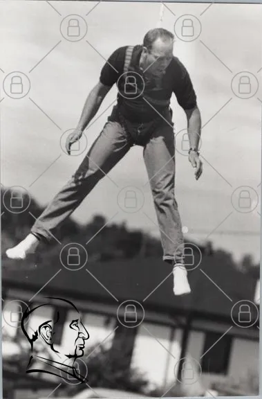 man, hoppande, svartvit, jeans, tröja, skor, utomhus, rörelse, sport, fotografi, 1980-tal, ungdom, energi, lekfull, bakgrund, natur, himmel, stil, mode, aktiv, glädje, frihet, dynamik, kroppsspråk, uttryck, action, motion, stilren, casual, retro