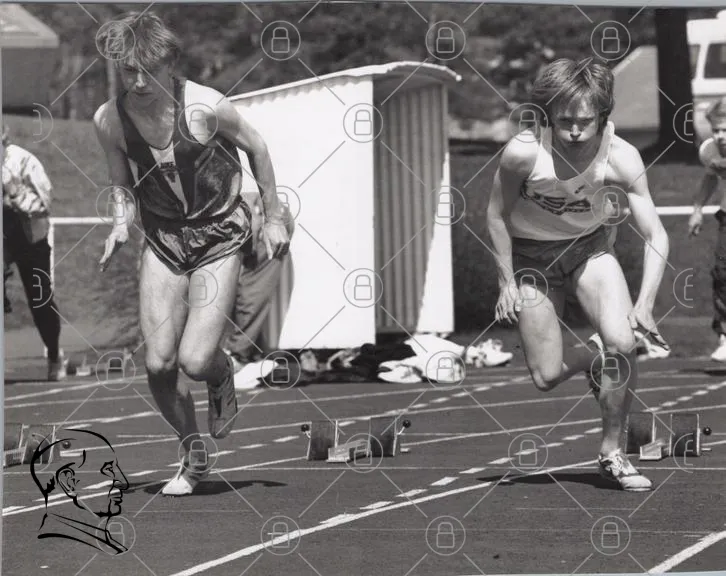 löpare, sprint, tävling, idrott, sport, bana, träning, atlet, motion, svartvitt, ungdomar, hastighet, prestation, fokus, energi, startblock, tävlingsdräkt, utomhus, sommar, konkurrens