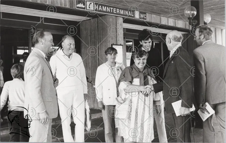 hamnterminal, WC, personer, handskakning, svartvitt, byggnad, män, kvinna, barn, kläder, 1970-tal, möte, leenden, vänskap, offentlig plats, fotografi, historia, socialt, samarbete, gemenskap, kultur