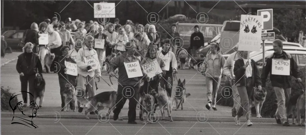 hundar, promenad, människor, skyltar, draghund, bombhund, svartvitt, hundträning, hundutställning, sällskap, hundägare, hundar i koppel, evenemang, utomhus, samling, hundsport, hundar av olika raser, hundar på rad, hundar och människor, hundar i grupp