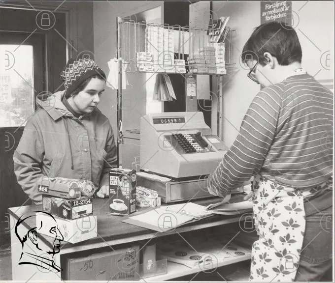 butik, kassörska, kund, kassaapparat, varor, svartvitt, retro, 1980-tal, mat, dryck, förpackningar, kläder, hatt, inredning, disk, service, försäljning, livsmedel, handel, lokal, människor