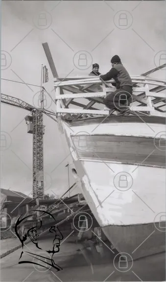 båt, byggnation, trä, hantverk, arbete, män, verkstad, marina, segelbåt, konstruktion, hamn, svartvitt, traditionell, sjöfart, handarbete, verktyg, plattform, mast, segel, industri, historia, renovering, båtbyggeri, utomhus, himmel, moln, arbetsplats, sjö, transport, kultur