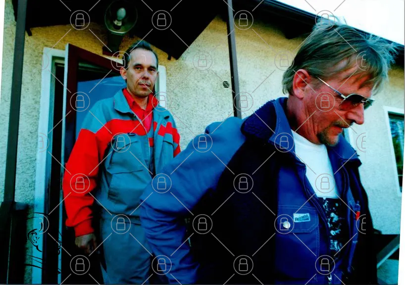 två män, arbetskläder, utomhus, byggnad, jacka, röd tröja, glasögon, kort hår, skägg, väst, fönster, vägg, tak, lampa, dagtid, arbetare, industriell miljö, man i förgrunden, man i bakgrunden