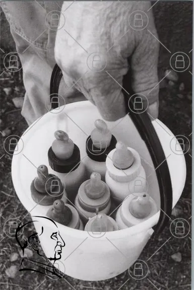 hink, nappflaskor, hand, grepp, plastflaskor, utomhus, svartvit, bärhandtag, flera flaskor, jord, mark, lock, napp, förvaring, transport, vätska, behållare, flaskor, vuxenhand, gård