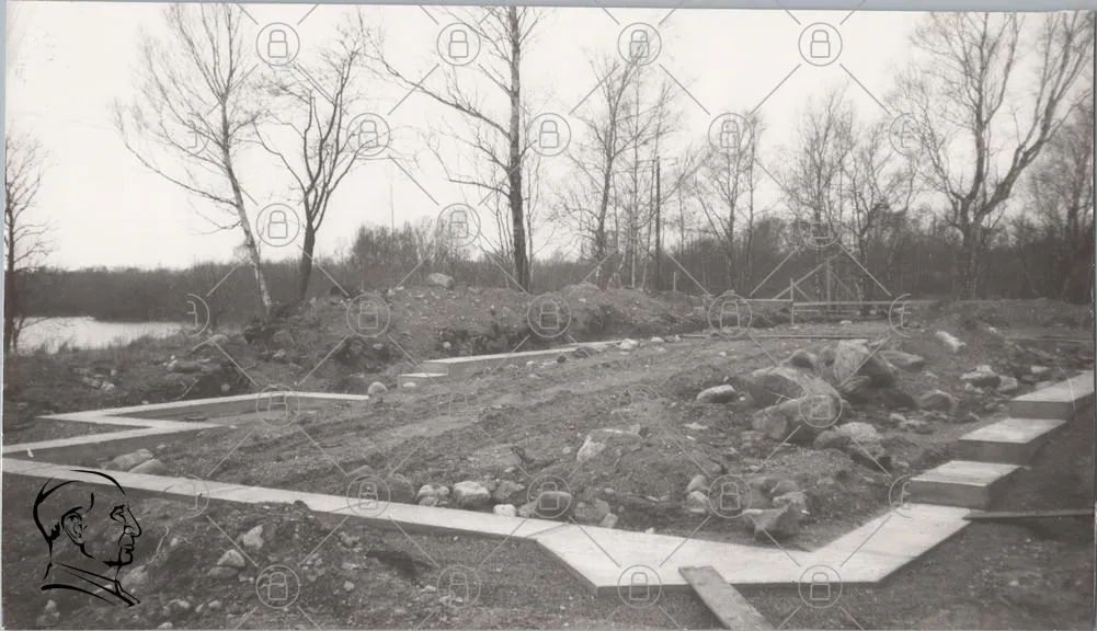 byggarbetsplats, grund, markarbete, träd, stenar, grus, konstruktion, landskap, natur, betong, byggmaterial, höst, rör, omgivning, projekt, planering, utgrävning, tomt, byggnation, miljö, skog, väder, svartvit, foto, arkitektur, design, utveckling, arbete, struktur, yta
