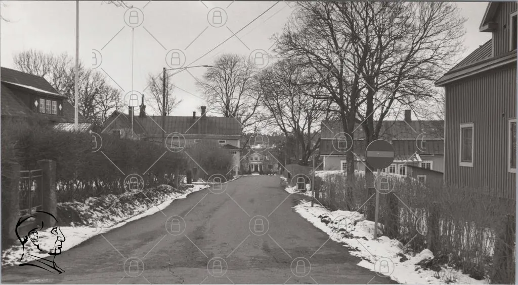 gata, träd, hus, vinter, snö, landskap, svartvit, vägskylt, grönska, byggnader, natur, stillhet, landsbygd, himmel, elledningar, väg, bostadsområde, avstånd, lugn, atmosfär, skugga, grusväg, arkitektur, fotgängare, perspektiv, raderade färger, avskildhet, traditionell, gammal, lugn miljö