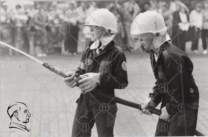 brandmän, barn, hjälmar, brandslang, uniformer, utryckning, svartvitt, gatufoto, publik, säkerhet, teamwork, brandövning, skyddsutrustning, ungdomar, brandkår, vatten, samarbete, brandbekämpning, demonstration, evenemang