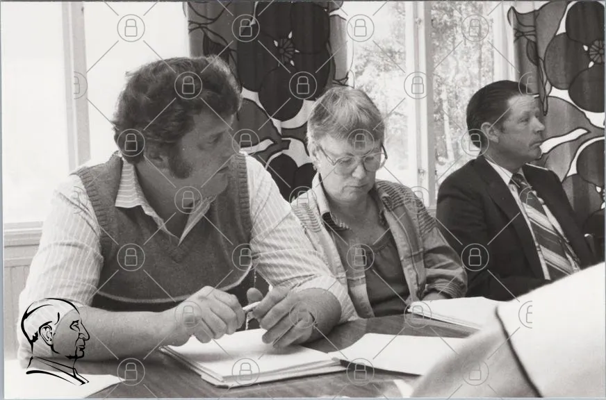 svartvitt, möte, människor, anteckningar, bord, kläder, diskussion, inomhus, 1970-tal, glasögon, man, kvinna, professionell, samarbete, dokument, skrivande, fokus, uttryck, interaktion, kontor, grupp