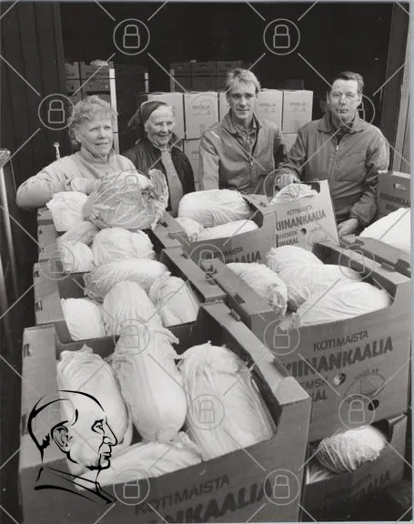 kål, grönsaker, lådor, människor, skördefest, jordbruk, tradition, svartvitt, familj, arbete, landsbygd, Finland, samarbete, försäljning, produktion, frukt, grönsaksmarknad, lokal, natur, gemenskap