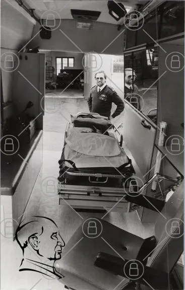 ambulans, bår, sjukvård, man, uniform, spegel, interiör, sjuktransport, svartvit, räddningstjänst, fordon, sjukvårdspersonal, dörr, garage, medicinsk utrustning