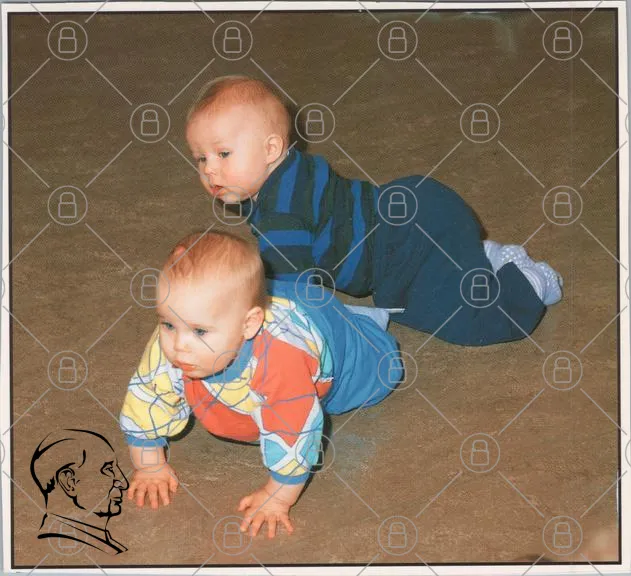 bebisar, krypa, lek, färgglada kläder, inomhus, golv, barn, två, ansikten, skratt, barndom, aktivitet, kompisar, kläder, mjuka, gulliga, tidigt 90-tal, fotografi, minnen, familj