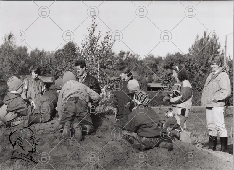 barn, lek, sand, park, träd, vuxna, gräva, vinterkläder, aktiviteter, utomhus, svartvitt, gemenskap, skratt, natur, sandlåda, familj, vänner, roligt, barnspel, samarbete