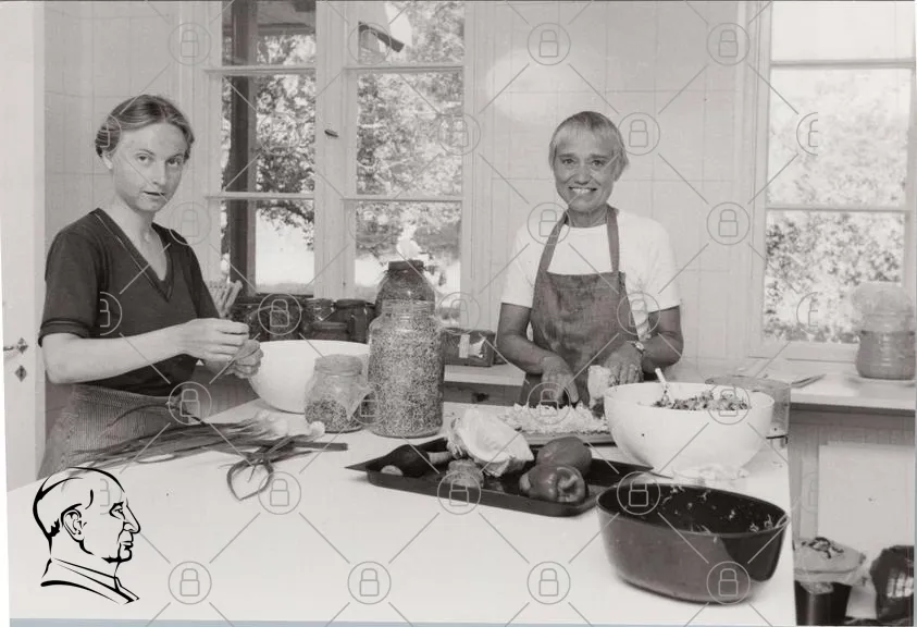 matlagning, kök, kvinnor, svartvitt, grönsaker, skärbräda, ingredienser, recept, förberedelse, hantverk, gemenskap, kreativitet, redskap, bänkskiva, glasburkar, skålar, skratt, arbete, tradition, hemlagat, hälsosamt, kultur, samarbete, måltid, familj, natur, ljus, atmosfär, handarbete, njutning