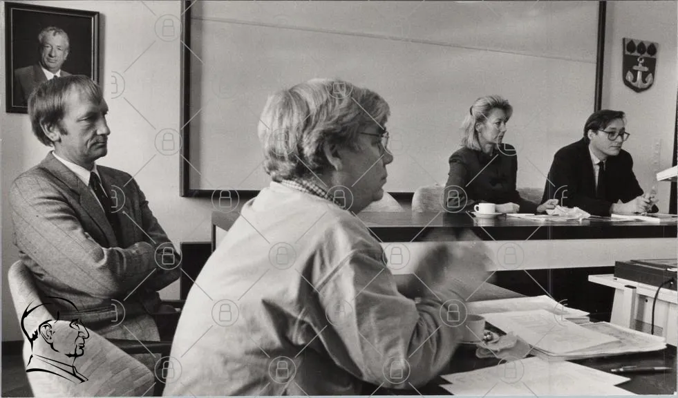 möte, konferensrum, personer, diskussion, bord, kaffekopp, glasögon, svartvitt, formellt, presentation, skrivtavla, interaktion, arbetsmiljö, samtal, kontor